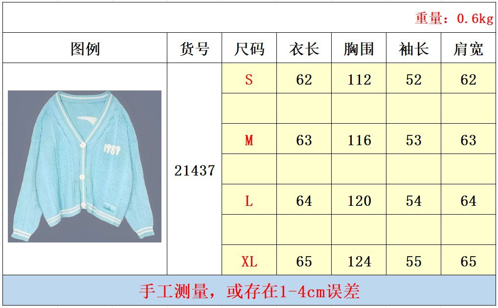 Size S: Bust 108cm, Sleeve 48cm, Shoulder 54cm, Length 57cm
